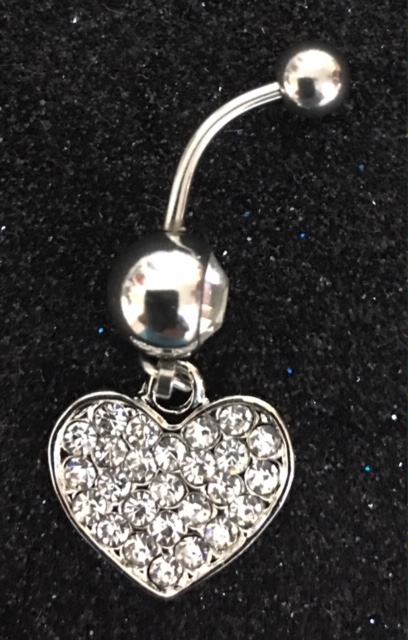 mooie navel piercing met witte steen in balletje en hanger met hart bezet met witte steentjes